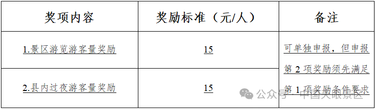 设置游览游客量奖励(至少需购买中国天眼景区摆渡车票,下同)和县内过夜游客量奖励两个类别。奖励标准如下: