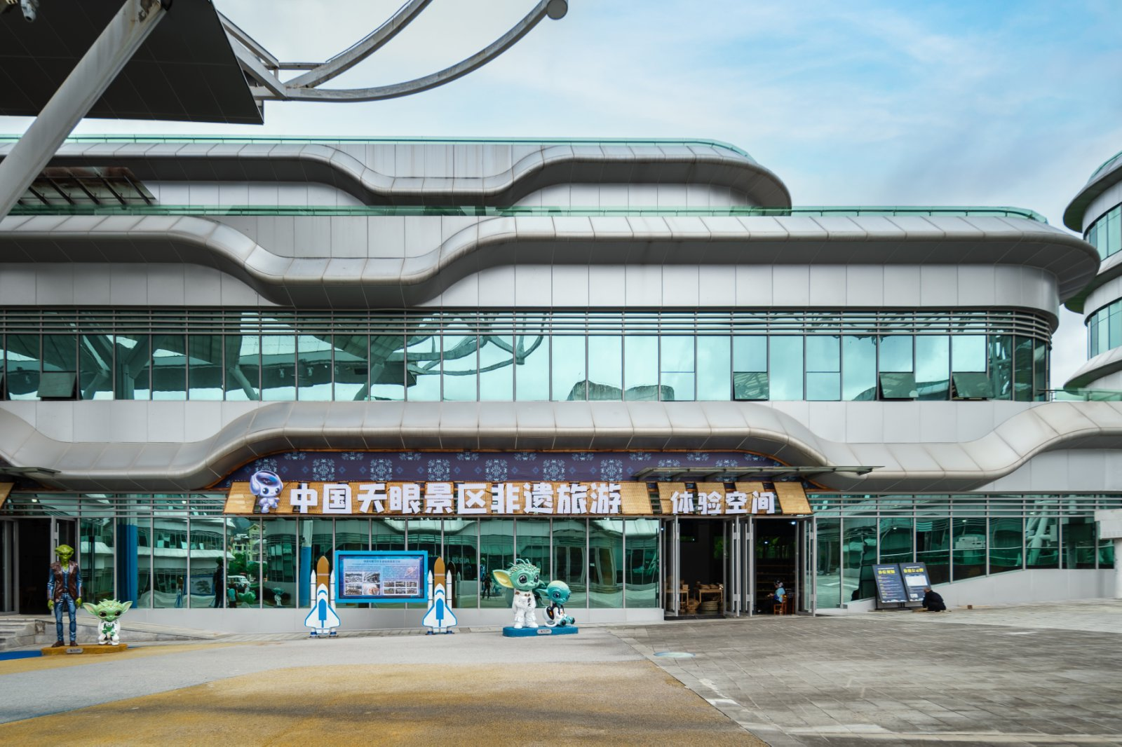 非遗旅游体验空间作为中国天眼景区(FAST)重要的文化板块,致力于展示和传承贵州丰富多彩的非物质文化遗产,是全国首个以“天文+非遗”为主题的体验空间。体验空间设置了非遗市集、文创产品展销区、农特产品展销区、牙舟陶工坊、豆腐工坊、鲁班木工坊、茶艺坊、绣娘 工坊、直播间、洽谈室、茶吧区等功能区,总面积达1419平方米。体验空间以“非遗文化传承+文旅融合发展”为核心定位,构建集非遗技艺交流与传承、文化推广、旅游体验、非遗文创、天文元素、农特产展销、直播带货、品牌推荐、招商合作等功能为一体的综合性平台,是中国天眼景区向游客展示贵州地域文化、赋能乡村振兴的重要窗口。
