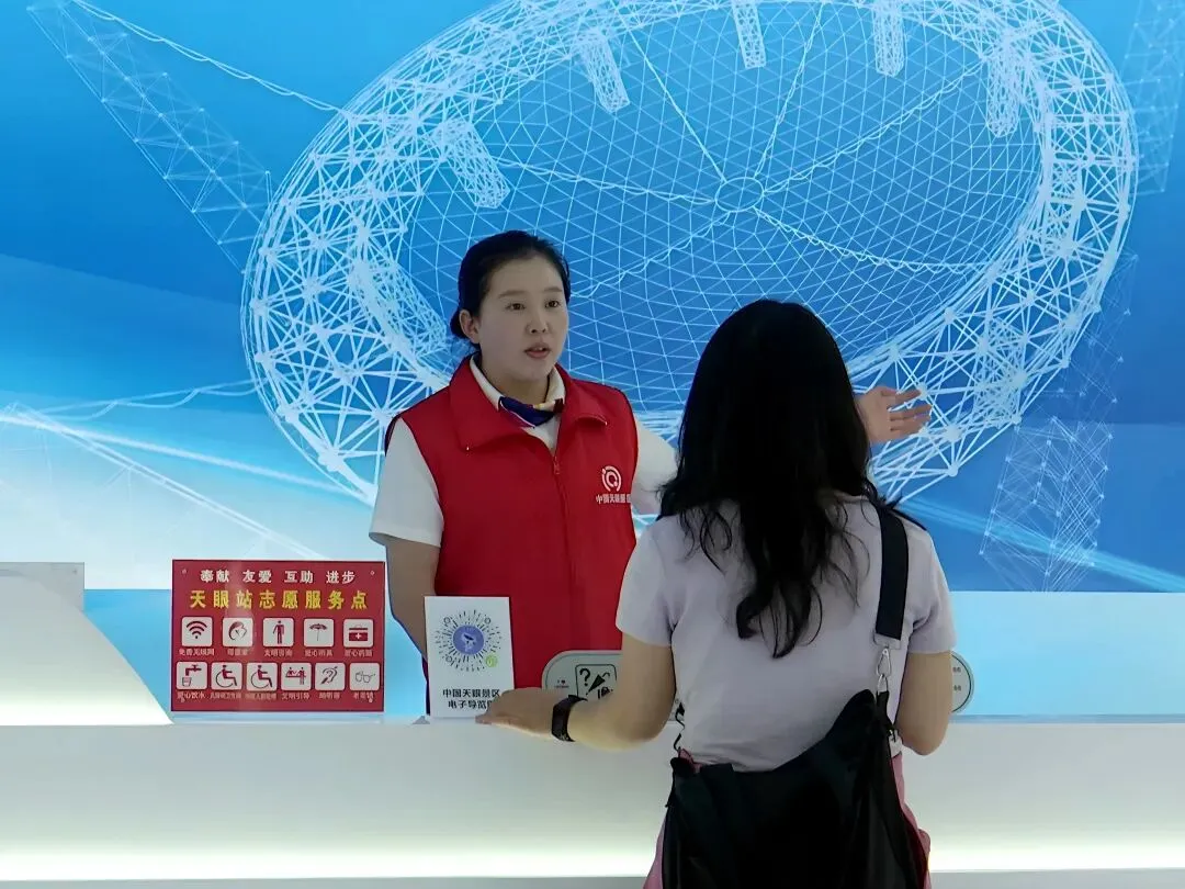 被誉为“中国天眼”的500米口径球面射电望远镜,不仅是国之重器,也成为了享誉中外的旅游名片。如今,这个探索宇宙奥秘的科普研学首选地,正以创建国家5A级旅游景区为契机,全力提升服务质量,让前来参观的游客感受到暖暖的“温度”。志愿者为游客指引方向走入中国天眼景区,随处都能看到志愿者们忙碌的身影,他们或热情地为游客指引方向,或耐心地为游客答疑解惑,或开展天文知识科普,让“志愿服务”成为这里的第一张暖心名