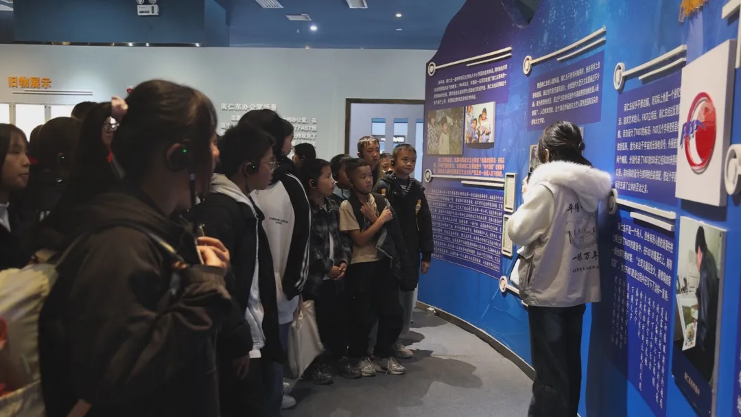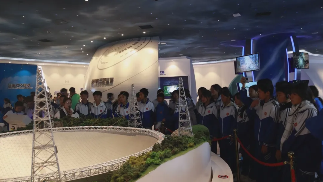 在天文体验馆,研学学生们聆听脉冲星的声音,听取天文观测发展历程、FAST建造历程讲解,观看“中国天眼”模型、形式多样的天文科普项目展示,沉浸式学习天文知识,感受国家科技的快速进步和发展。
