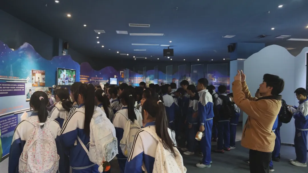 在南仁东纪念馆,研学学生聆听讲解员的介绍后,被南仁东先生爱岗敬业、敢为人先、迎难而上、无私奉献的科学精神和爱国情怀所感动。