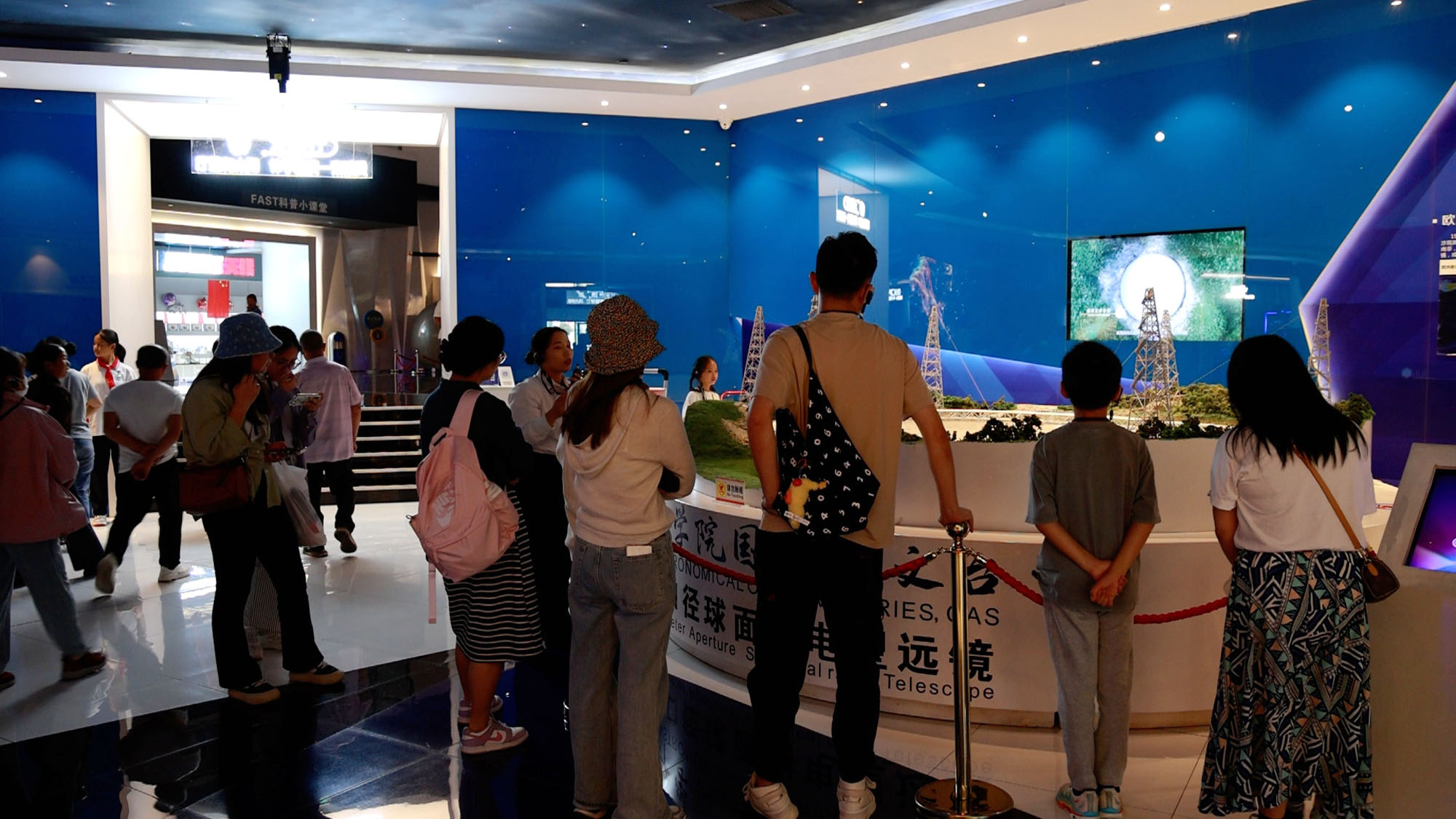 国庆中秋假期,中国天眼景区迎来天文科普游热潮,各地游客慕名前来,领略“中国天眼”科技魅力,学习天文知识,探索浩瀚宇宙奥秘。在天文体验馆,游客们认真聆听讲解,一边学习天文知识、感受国之重器的科技魅力,一边拿出手机拍照留念,定格美丽瞬间,进一步了解FAST建造历程以及各类天文知识,探索宇宙奥秘。在天文体验馆内参观杭州游客王雯对记者说:“我们就想着趁着国庆假期带孩子过来沉浸式体验一下‘中国天眼’,探索天