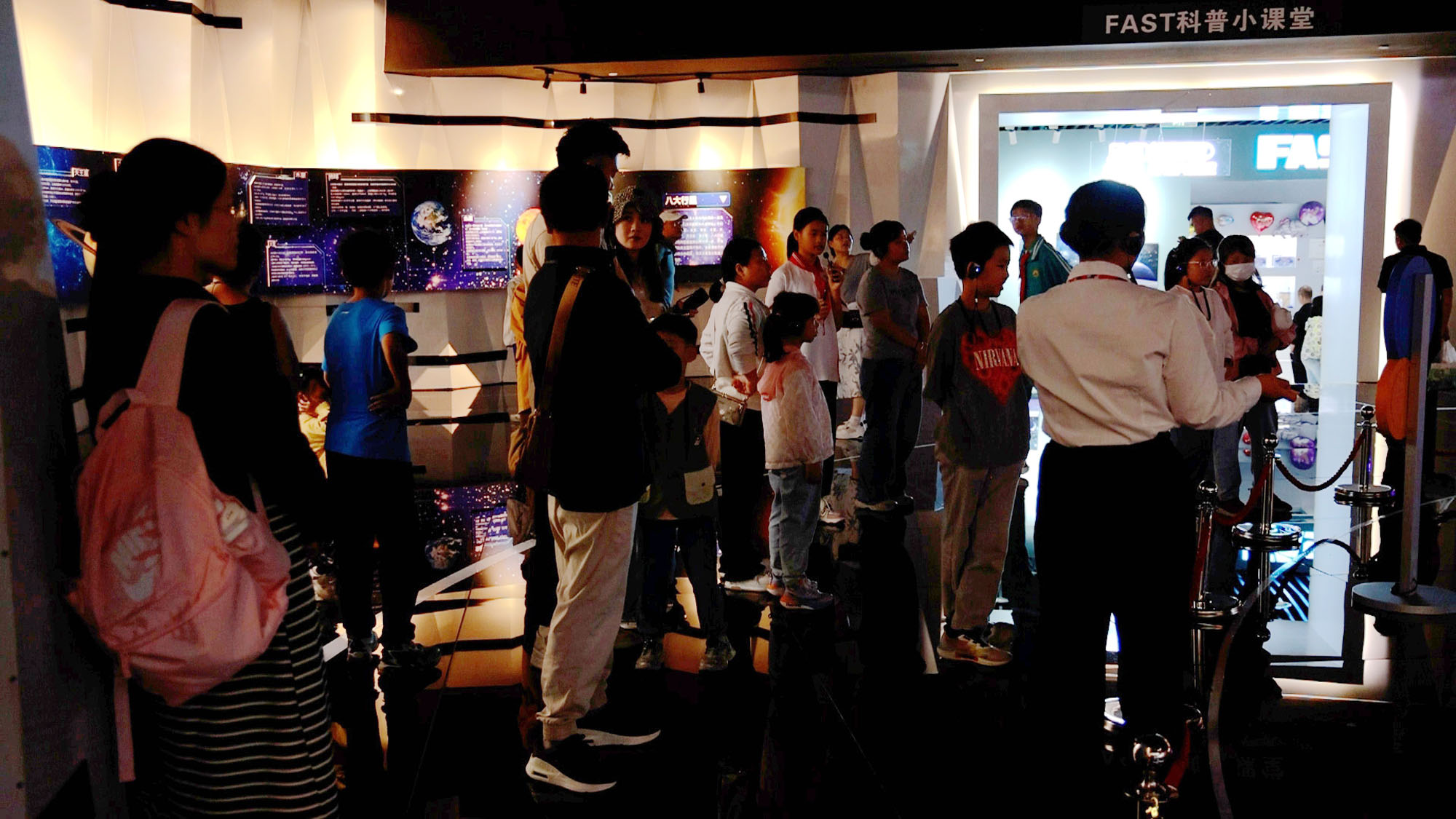 杭州游客王雯对记者说:“我们就想着趁着国庆假期带孩子过来沉浸式体验一下‘中国天眼’,探索天文的奥秘。”