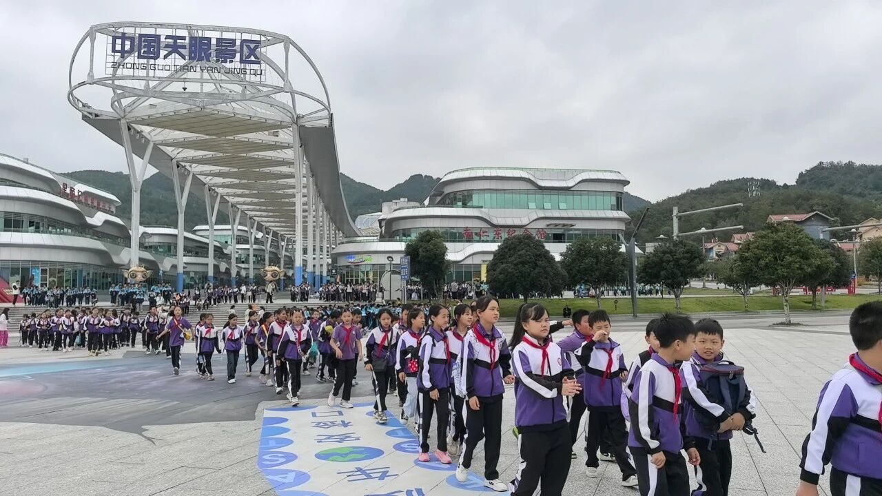 “大家看,眼前这个像‘巨锅’一样的建筑,就是能捕捉百亿光年外射电信号的中国天眼!它的口径相当于30个足球场,能接收到宇宙中最微弱的电磁信号——比如一颗脉冲星每秒钟发出的信号,比手表的滴答声还慢。”在天眼观景台,讲解员的声音胜似扩音器,传到50多名小学生耳中。孩子们举着天文望远镜模型,踮着脚望向远处的“巨锅”,眼神里满是好奇。