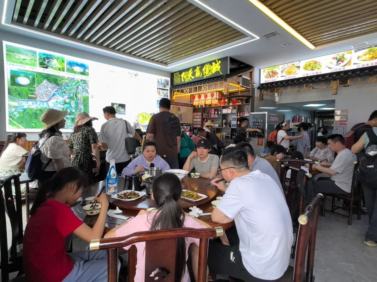 上午11点,平塘县天文小镇的星际家园“天眼风情街”已经热闹起来。沿街的农家乐里,老板们正忙着给客人端菜:“来啦!这是我们本地的酸汤鱼、盐酸扣肉,都是新鲜食材做的!”她的农家乐名叫“星空人家”,窗户上贴着脉冲星图案的窗花,“以前我在外地打工,后来听说天眼景区火了,就回来开了这家店,现在每年能赚20多万,比打工强多了!”