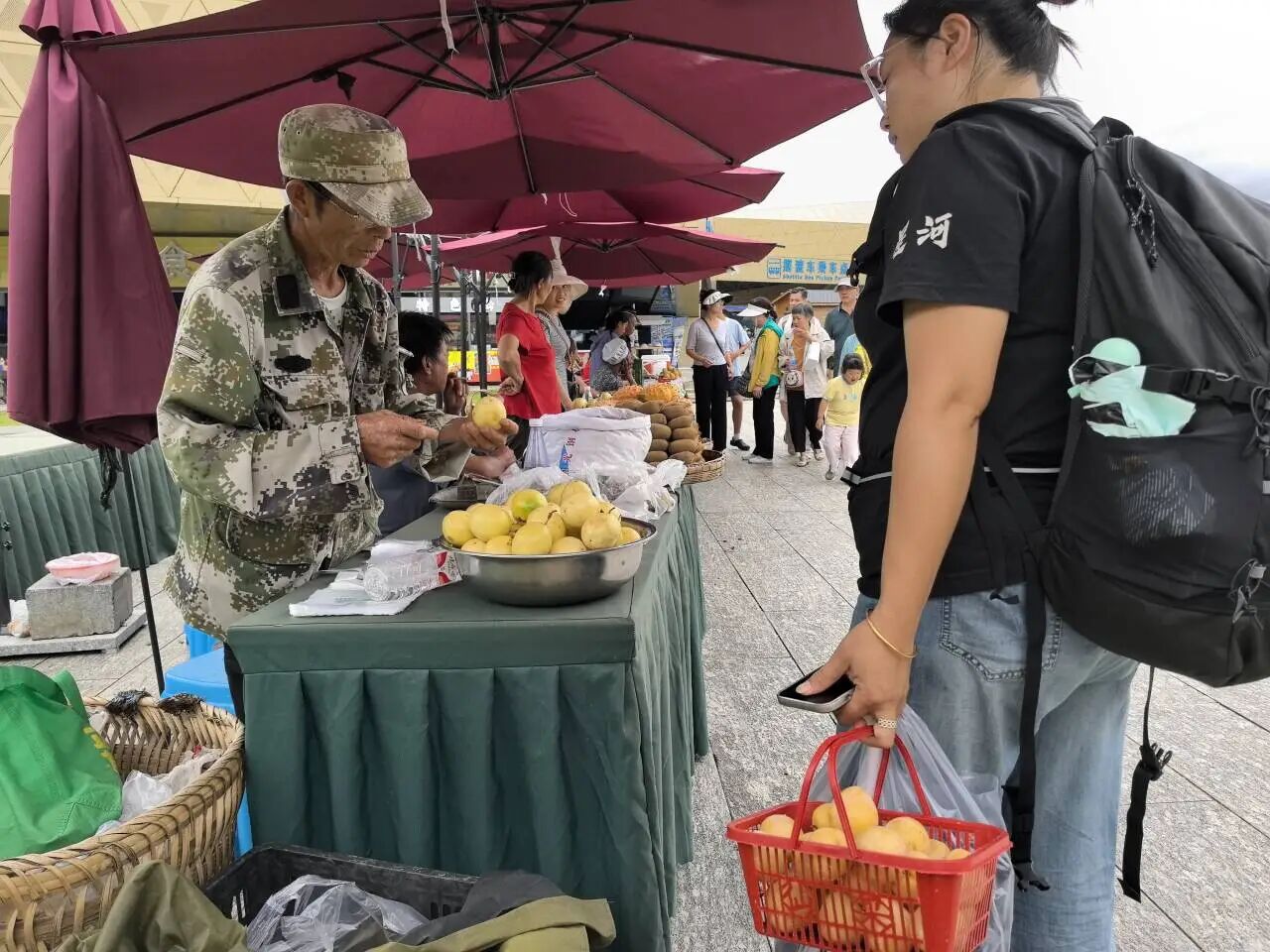 游客正在天文体验馆旁的农产品销售点购买农产品